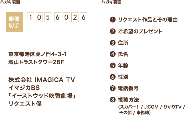 ![イマジカBSでは6月スタートの開局20周年記念企画「史上最大のイーストウッド特集」で放送する52作品の中から、厳選した作品の日本語吹替版を連続放送する「イーストウッド吹替劇場」を今秋スタートします!そこで皆さまから、「イーストウッド吹替劇場」で放送してほしい作品のリクエストを募集します![リクエスト募集締め切り:2016年7月31日(日)]そしてさらに…リクエストしていただいた方の中から抽選で豪華賞品をプレゼント!](/20th_Anniversary/images/present_ce_start.png)