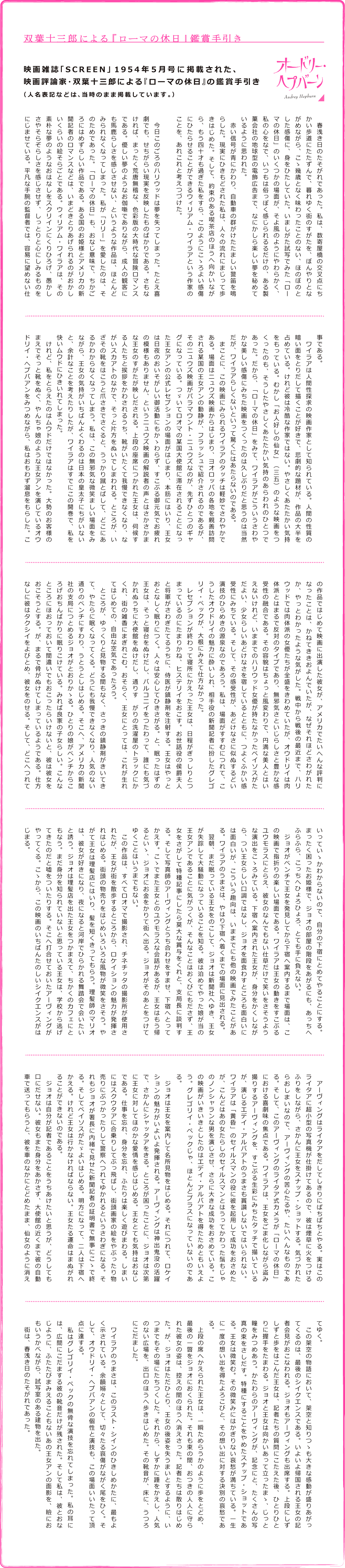 そんな彼女の映画が公開された当時、「SCREEN」にて掲載された映画評論家による『ローマの休日』の鑑賞手引きと、オードリー・ヘプバーンが表紙を飾った当時の表紙を特別に公開。 映画と合わせて、お楽しみください。